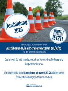 Die Gemeinde Moormerland stellt zum 01. August 2026 eine/n Auszubildende/n als Straßenwärter/in (m/w/d) für den gemeindeeigenen Bauhof ein.