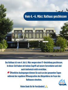 Das Rathaus ist vom 4. bis 6. März wegen einer IT-Umstellung geschlossen.