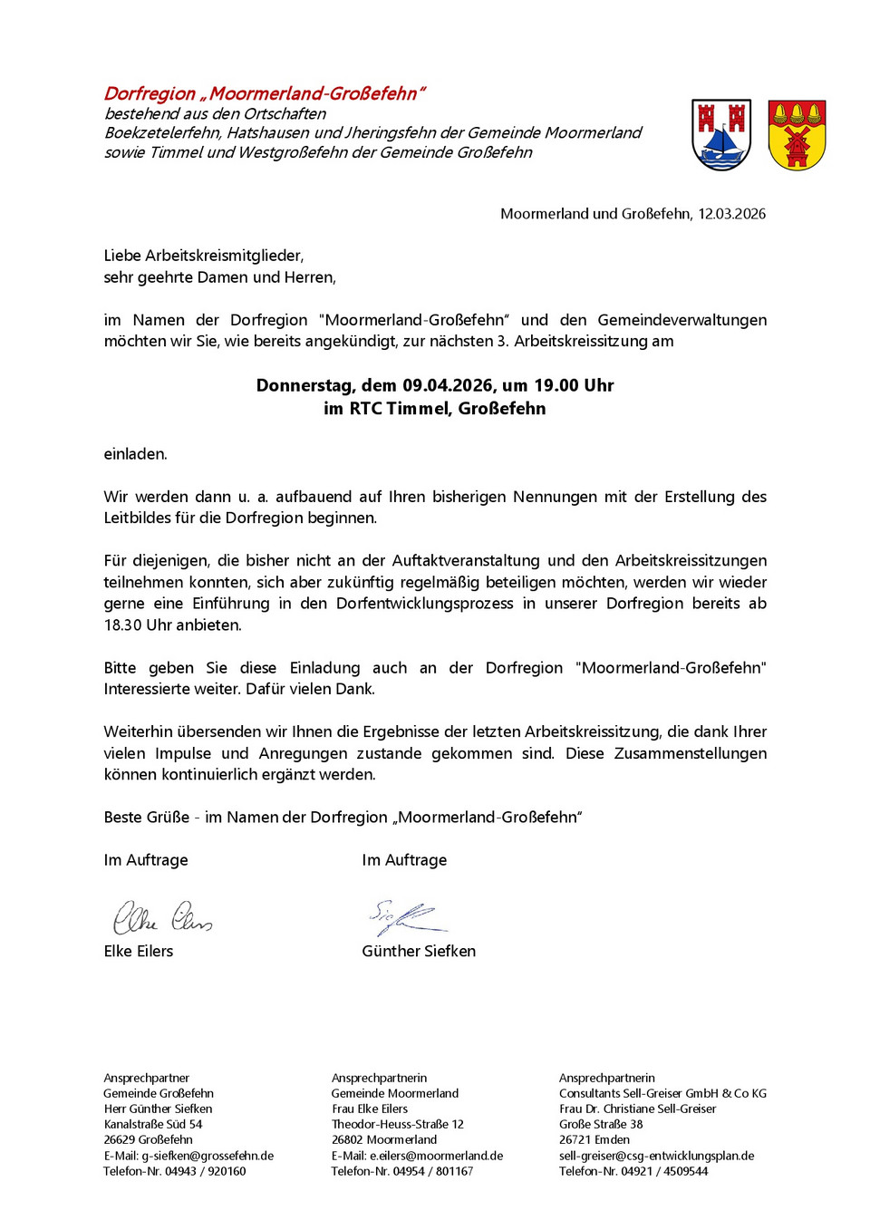 Wir freuen uns sehr, dass die Dorfregion Moormerland–Großefehn in das Dorfentwicklungsprogramm des Landes Niedersachsen aufgenommen wurde. Damit beginnt nun offiziell ein gemeinsamer Prozess, bei dem wir die Zukunft unserer Dörfer aktiv gestalten und stärken können.