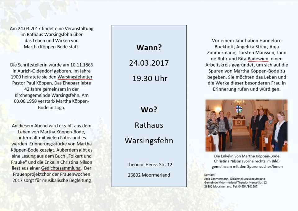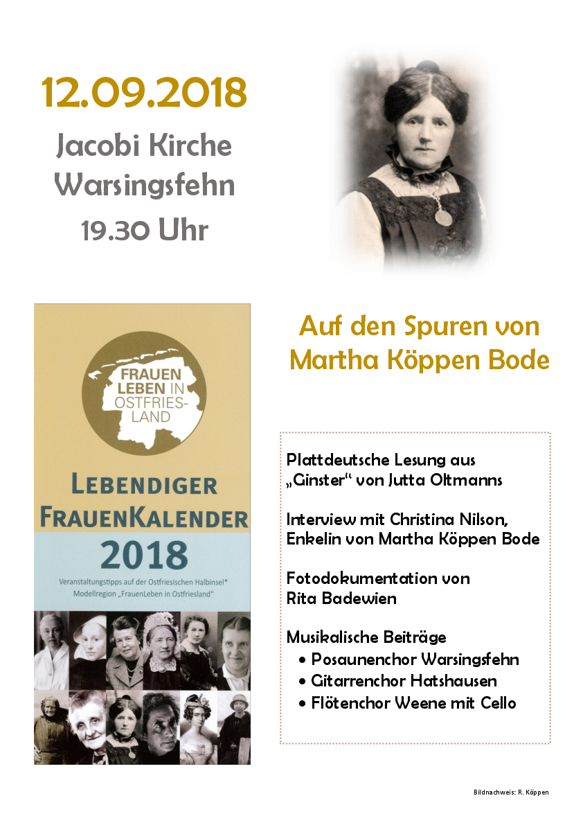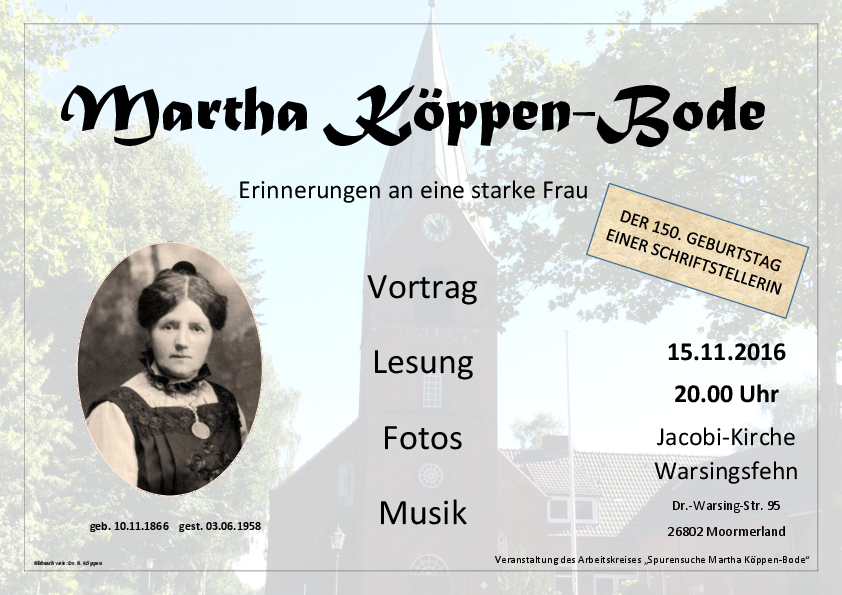 Martha Köppen-Bode wurde am 10.11.1866 im Pfarrhaus in Aurich-Oldendorf als Martha Bode des dortigen Pastoren und Superintendenten Diedrich Bode geboren. Ihre Mutter war eine geborene Siefkes aus Leer und somit war Martha eine Kusine zu Wilhelmine Siefkes aus Leer. Durch ihre Heirat im November 1900 mit Pastor Paul Köppen aus Warsingsfehn, zieht sie in das Fehntjer Pfarrhaus. Pastor Köppen wirkte von 1895 bis 1942 als Seelsorger in der Gemeinde. Schon als Mädchen beginnt Martha Gedichte und Geschichten zu schreiben. Ihr erstes und zugleich erfolgreichstes Buch mit dem Titel „Leute vom Moorrand“ erscheint 1907. Dieses literarische Werk – als Autorin hängt sie ihren Mädchennamen an ihren Familiennamen - wird noch zwei weitere Male neu aufgelegt: 1934 in Emden, und 1983 im Verlag Schuster-Leer.