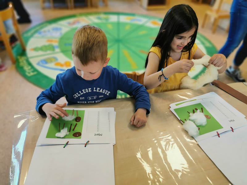 Im Jahr vor der Einschulung beginnt für die Kinder ein zusätzliches Programm zur Förderung der Schulfähigkeit. Hier weben die Kinder einen Panzer für ihre eigene Kuschelschildkröte.