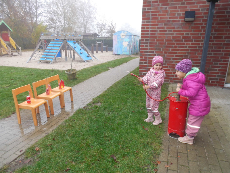 Ein Vorschulprojekt ist zum Beispiel zum Thema Feuerwehr. Auf dem Bild sieht man Kinder mit einer Kübelspritze ein Feuer löschen.