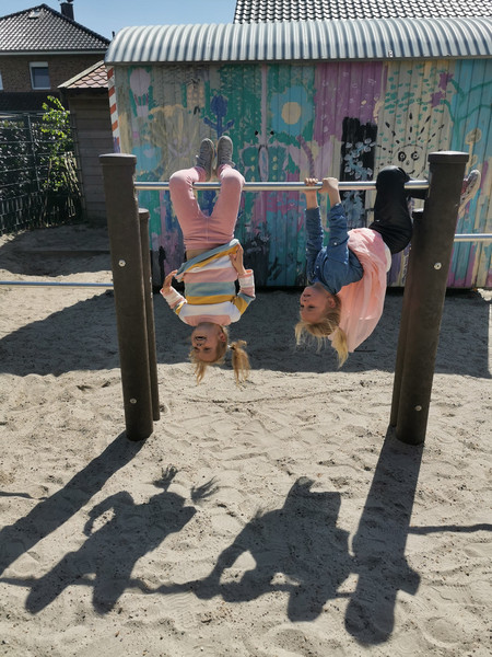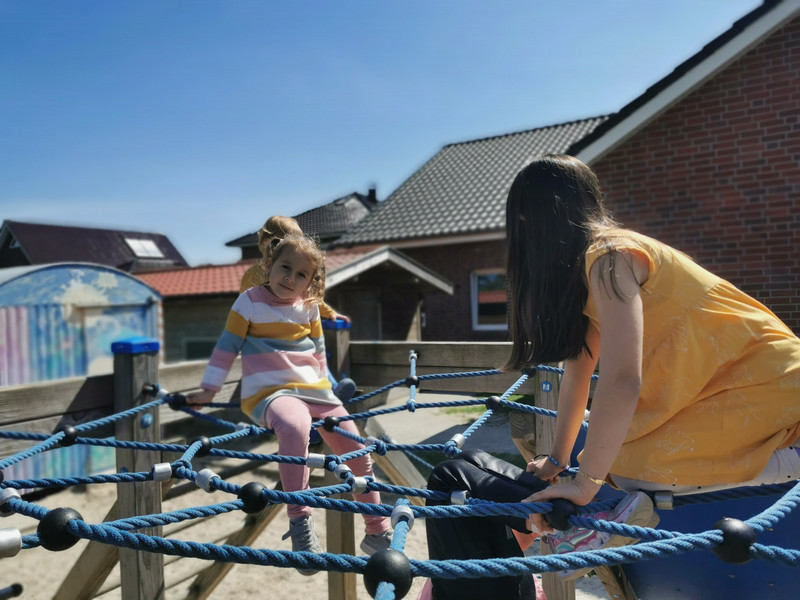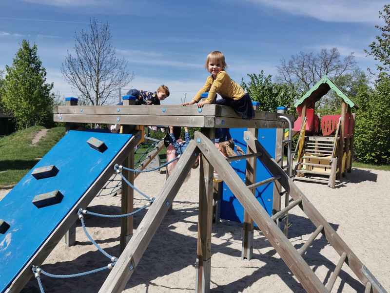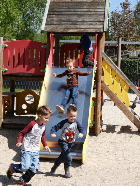 Draußen gibt es einen Spielplatz mit Schaukeln, Rutsche, Balancier- und Klettermöglichkeiten. Ebenso bietet der Spielplatz Sandkästen und durch seine Bepflanzung den Kindern zusätzliche Spielecken (Höhlen) und Naturerfahrungen.