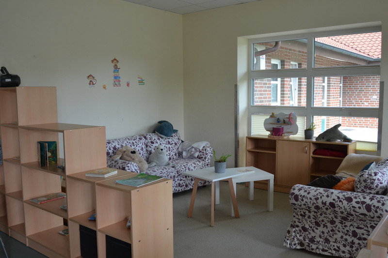 Auch eine große Leseecke findet man in diesem Raum. Die Kinder haben Bücher zum Anschauen zur freien Verfügung um den selbständigen Umgang mit Büchern zu erlernen. Mehrere Tonieboxen und dazugehörige Figuren benutzen die Kinder selbstständig. Die beiden Fachkräfte bieten regelmäßig Bilderbuchbetrachtungen und Kamishibai-Betrachtungen den Kindern an.