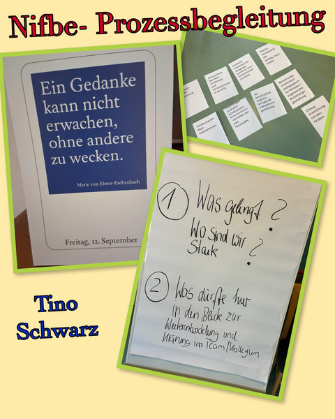 Auch für uns als pädagogisches Team ist Weiterentwicklung von großer Bedeutung. Deshalb freuen wir uns sehr, dass wir durch die Nifbe - Prozessbegleitung mit Tino Schwarz unterstützt werden. Gemeinsam dürfen wir eine Teamfortbildung wahrnehmen, um unser pädagogisches Handeln stets auf dem aktuellen Stand zu halten und weiter zu wachsen.