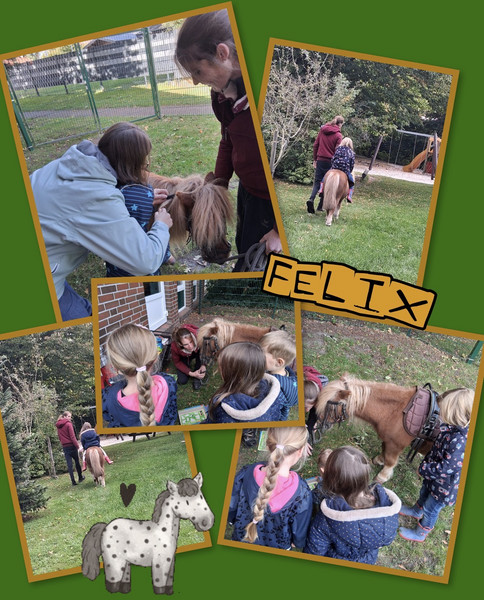 Ein weiteres Highlight ist unser regelmäßiger Besuch von Felix, der alle 14 Tage bei uns vorbeischaut. Mit ihm erleben die Kinder spielerisch den Umgang mit einem Tier: sie dürfen reiten, mitmachen, Verantwortung übernehmen und spüren, wie wichtig Rücksicht und Achtsamkeit sind. Diese Erfahrungen wirken weit über den Moment hinaus – sie bereichern das Miteinander unter den Kindern und den Alltag im Kindergarten.