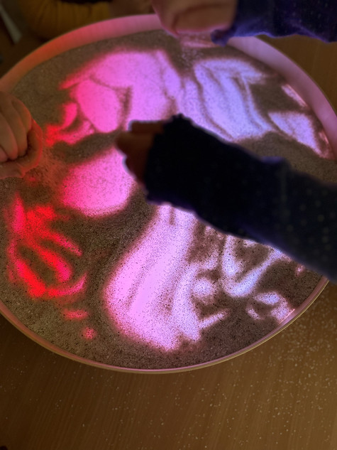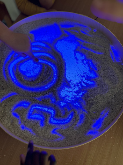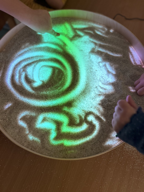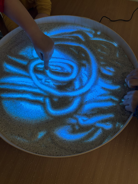 Unser Wahrnehmungsraum hat eine tolle Erweiterung bekommen – einen Leuchttisch! Heute wurde er zum ersten Mal gemeinsam mit Sand ausprobiert – und die Kinder waren begeistert! Mit ihren Händen haben sie bunte, leuchtende Bilder gemalt, gespürt, gefühlt und ausprobiert, was Licht, Farbe und Bewegung miteinander machen.
