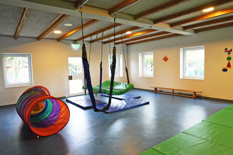 Der Bewegungraum verfügt über eine große Kletterwand, die der Förderung des Stellungs-, Kraft- und Bewegungssinns, der Bewegungsplanung - der Körperkoordination, dem Aufbau des Muskeltonus / Muskelanspannung, der Förderung der Geschicklichkeit sowie dem Einschätzen von Entfernungen und Höhenunterschied dient. Ausgestattet mit einem Ullewaeh! Bewegungskonzept bietet der Bewegungsraum ein innovatives und pädagogisch wertvolles Motorik- und Bewegungsangebot. Den Kindern stehen Fahrzeuge, Hüpfkissen, Bälle und viele weitere Spielzeuge unterschiedlichster Materialien zur Bewegungs- und Wahrnehmungsförderung zur Verfügung. Hier finden Freispielangebote und angeleitete Bewegungsangebote im Gruppenverband statt.
