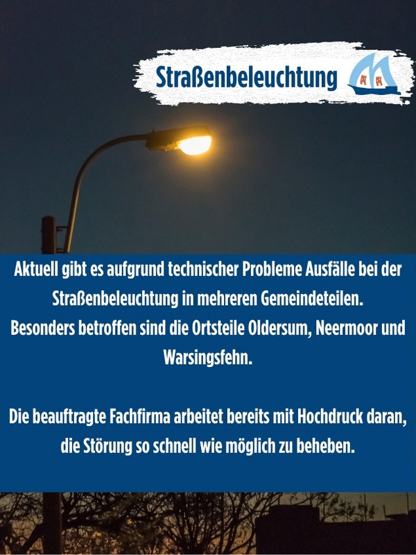 Aktuell gibt es aufgrund technischer Probleme Ausfälle bei der Straßenbeleuchtung in mehreren Gemeindeteilen.