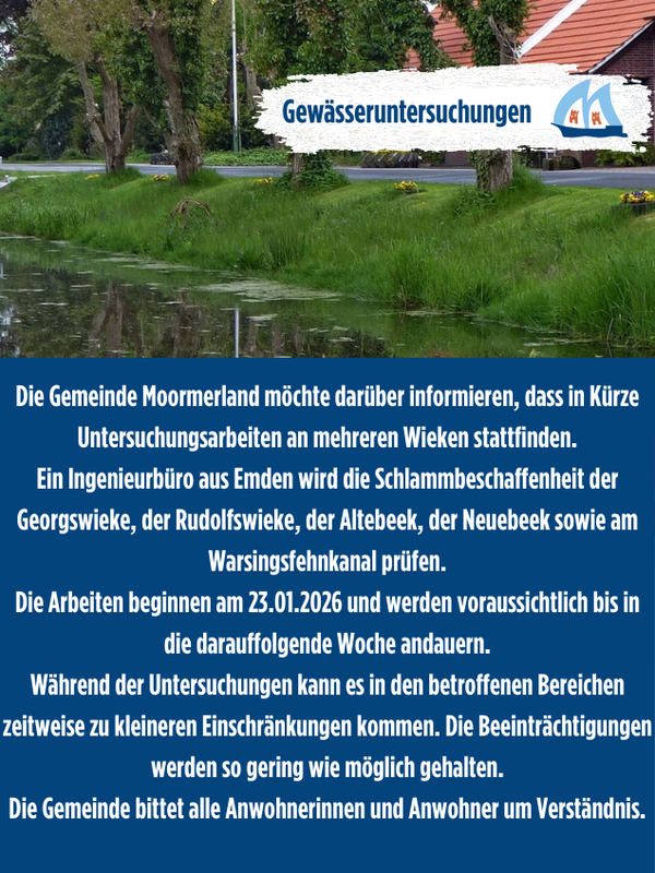 Die Gemeinde Moormerland möchte darüber informieren, dass in Kürze Untersuchungsarbeiten an mehreren Wieken stattfinden.