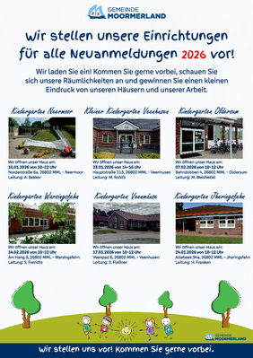 Unsere gemeindeeigenen Kindergärten stellen ihre Einrichtungen für alle Neuanmeldungen 2026 vor. Kommen Sie vorbei, schauen Sie sich die Räumlichkeiten an und gewinnen Sie einen kleinen Eindurck von unseren Häusern und unsere Arbeit: